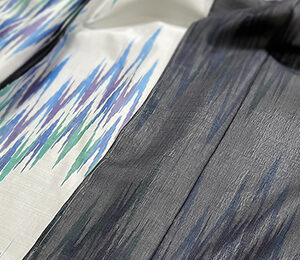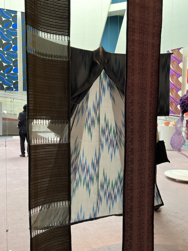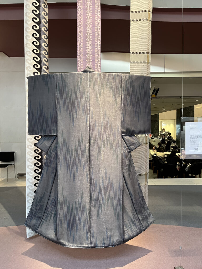 当初着物ということで、衣桁による展示を考えていましたが、他の伝統的な着物と一緒にしない方が見てくださる人にとってわかりやすい(この着物は、常識的ではない)ということを周りからアドバイスされました。わざわざパネルを付けて説明を掲載したのも、作者には説明責任があると強く指摘されたからです。わかってくれる人に見てもらえばいいというのは、作者のエゴなのだとか。作家とは、作ったものに対してなんとも重たい責任を持つのですね。