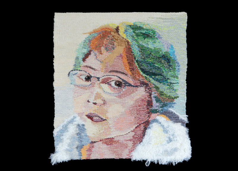 つづれ織りの自画像です。どんだけ自分好きなの?…いえ、大学の課題です。少しずつ引き揃える糸を変えて、明度、彩度の段階をつけて色糸を作ることで、全体の配色をまとめるように意識して織りました。多くの色を混色した、織物の鮮やかで深い色表現は、濁りや、違和感を感じさせません。