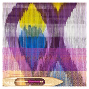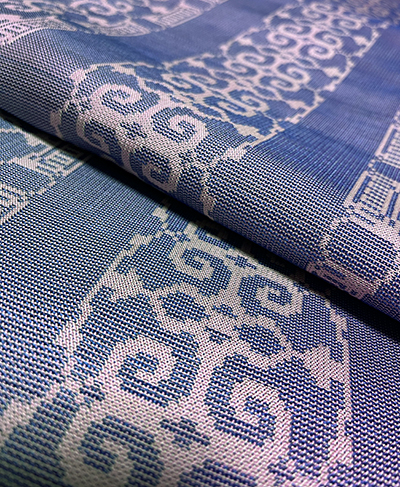 色彩の異なる経緯の糸の組織で、実際には存在しない混色を感じさせる玉虫織。見る角度、光の反射で、全く違う表情を見せる、有名ブランドのコートでお馴染みの虹色の織物です。