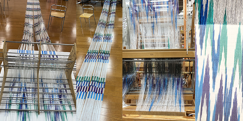 あらかじめ部分的に染めた経糸を前後にずらすことで動的な柄を作る経ずらし絣。ビニール紐で糸括って、1本の糸を何色にも染めた絣糸をずらし機にかけて、鯨尺1分(=3.8ミリ)単位で経糸をずらしていきます。絹糸の経絣は、絣がずれないように染めた部分だけ糊つけを行うので、糸がくっついていて、ずらし機にかけてずらすときに糸が切れやすく、大変でした。