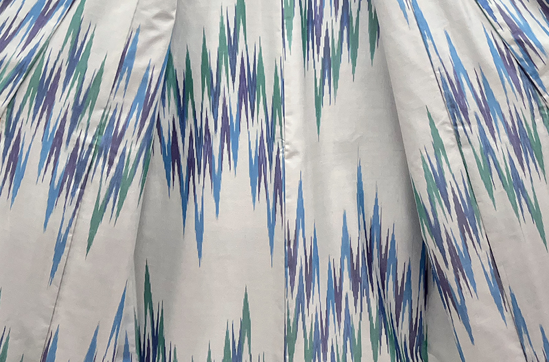 魂のない魔人を表現するために、紗の下地には、機械的な波動、デジタルイコライザーをイメージした、ジグザグ模様を絣で再現しました。